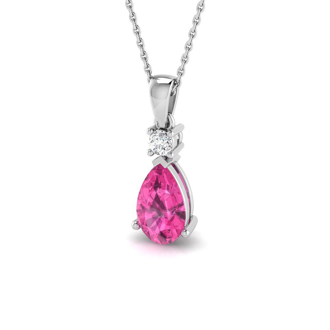 A striking and elegant pendant featuring a dazzling Pink Sapphire in a classic pear shape, complemented by a round brilliant Diamond accent. Set in luxurious 18k White Gold, this timeless piece adds a touch of sophistication and charm.