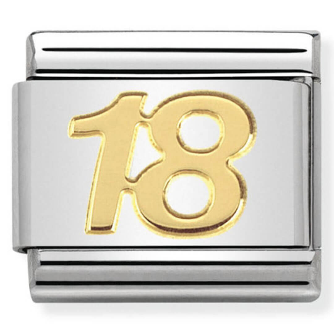 Original Charm in stainless steel and 18K gold for Nomination’s Composable Classic Bracelet with the Number 18. Made in Italy. This symbol represents the age of majority in a lot of countries. The perfect gift for a loved one’s 18th birthday.