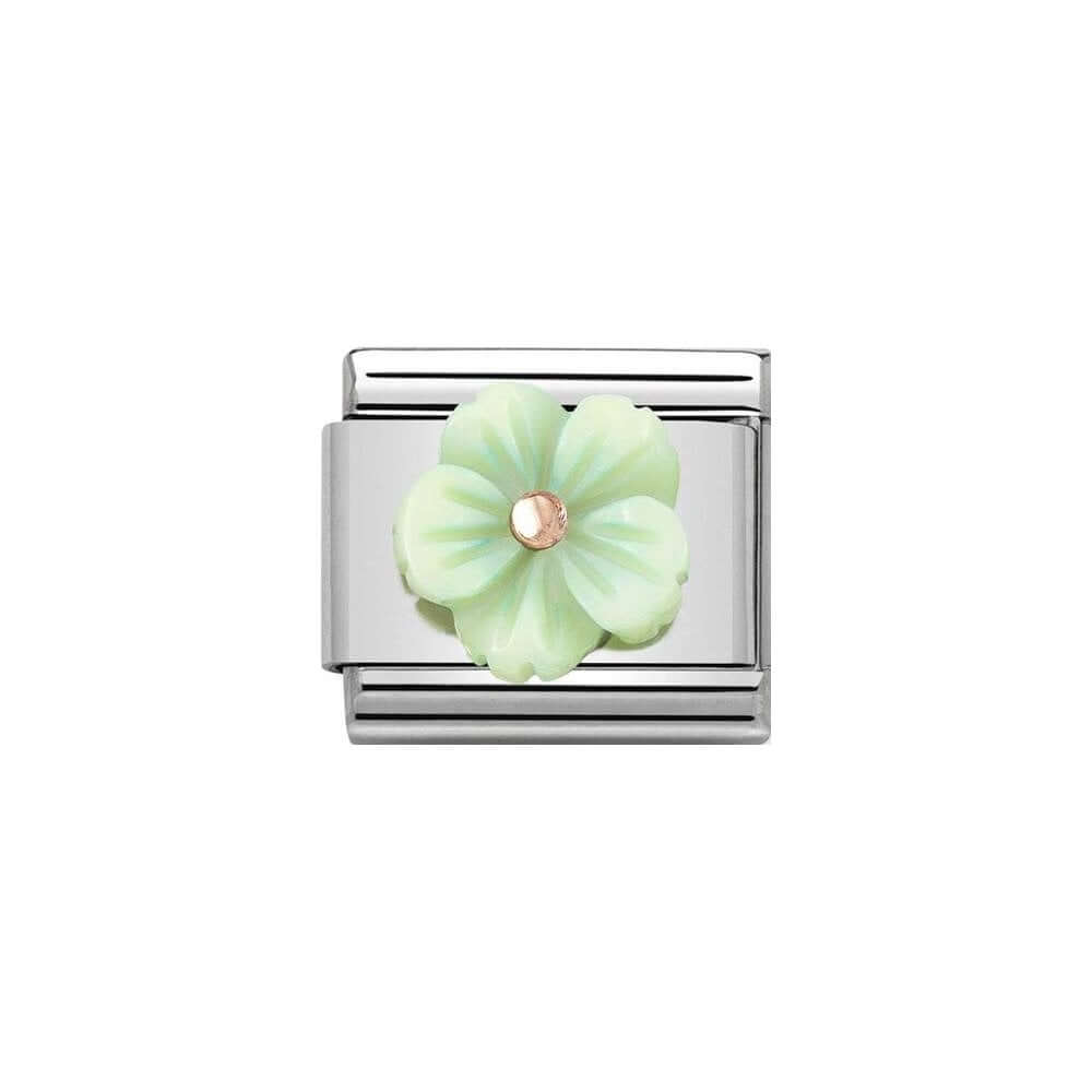 Stainless steel charm for original Nomination Composable Classic bracelet with Flower in green mother of pearl and details in 9K rose gold. Available in more colours. Made in Italy. Give a green flower for good luck.