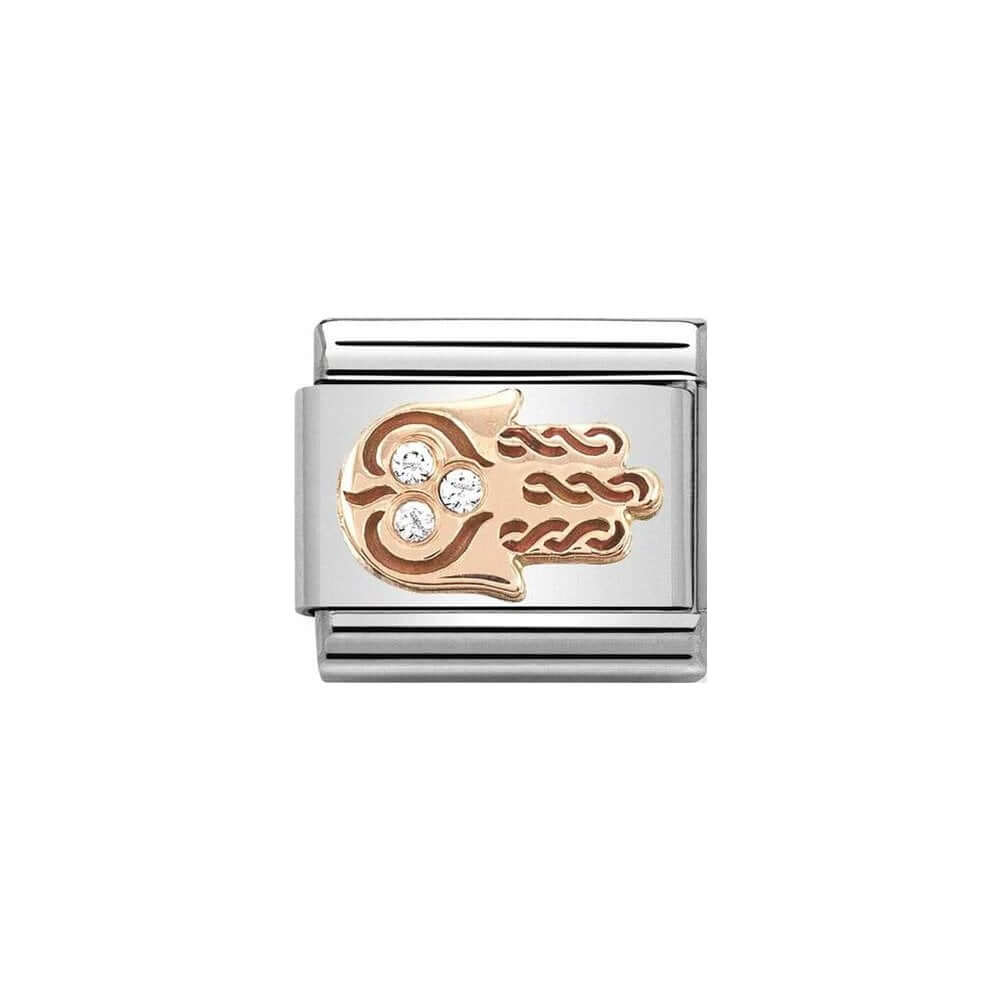 Original Nomination Link for Composable Classic Bracelets in Stainless steel with Hand of Fatima in 9K Rosegold with Cubic Zirconia. Made in Italy. The perfect Link to serve as a reminder of the Spirituality that guides you.