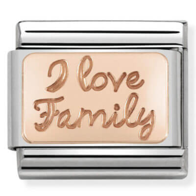 Original Charm for Nomination’s Composable Classic bracelet in stainless steel and 9K rose gold with “I love Family” engraved. Made in Italy. No love is stronger or more pure than your family’s love!