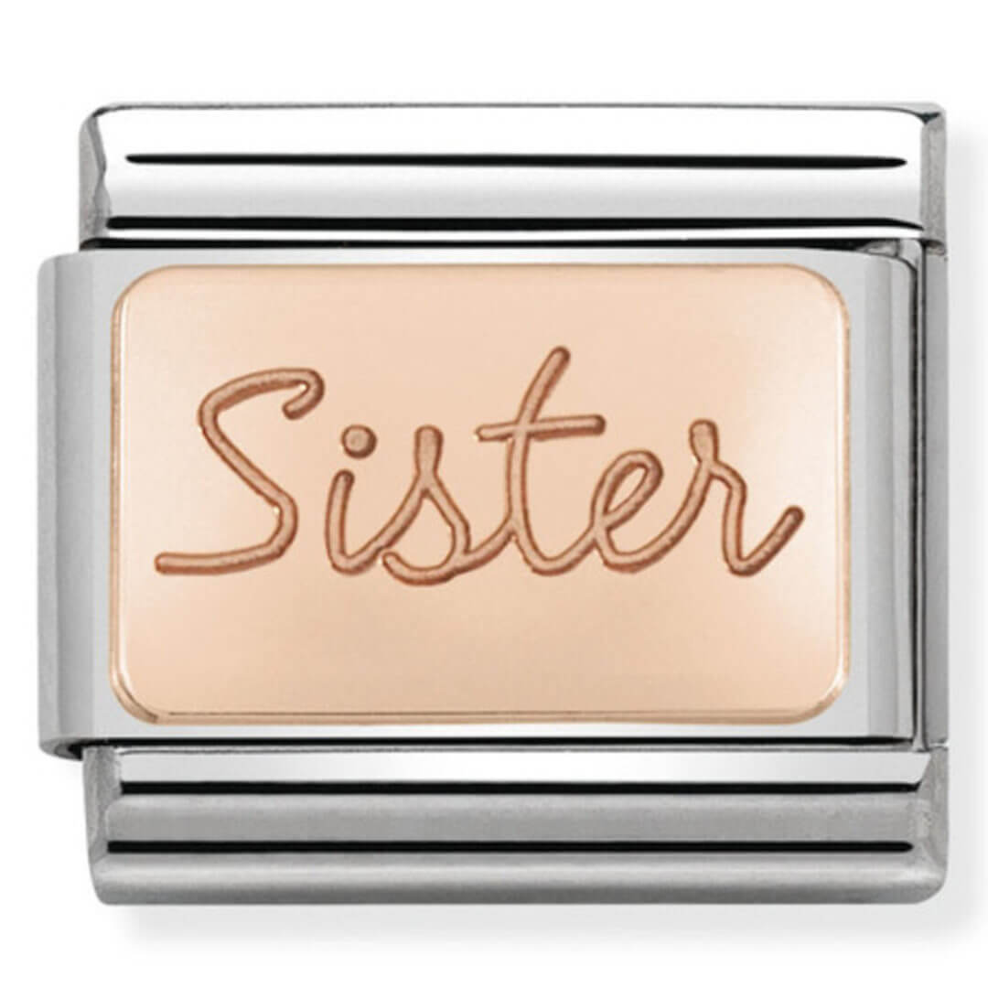 Original Charm for Nomination’s Composable Classic bracelet in stainless steel and 9K rose gold with “Sister” engraved. Made in Italy. Is your sister your best friend and confidant? Dedicate this special Charm to her!