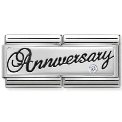 Original Charm for the Classic Composable bracelet in stainless steel, sterling silver and Swarovski Zirconia with “Anniversary” written out. Made in Italy. The perfect Charm to say “Happy Anniversary” to your significant other!