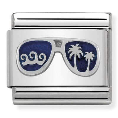 Original Charm for Nomination’s Composable Classic bracelet in stainless steel, sterling silver and blue enamel with Blue Miami Sunglasses with Palm Trees. Made in Italy. Palm trees, the ocean, the sea breeze and great sunglasses. There’s a look for each season.