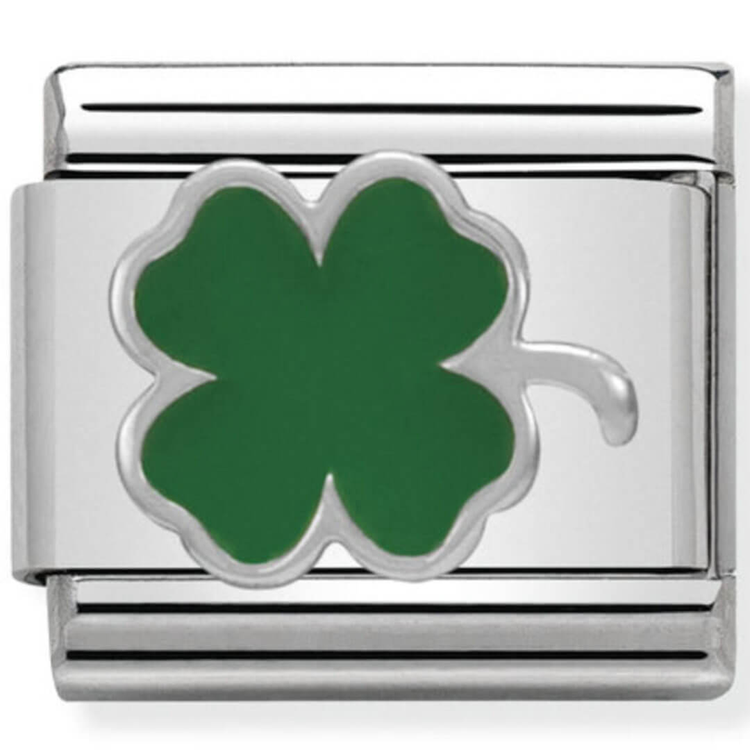 Nomination SilverShine stainless steel green lucky four leaf clover charm. SilverShine brings a great new look with this sparkling charm in sterling silver giving your Nomination bracelet a fantastic cool look.