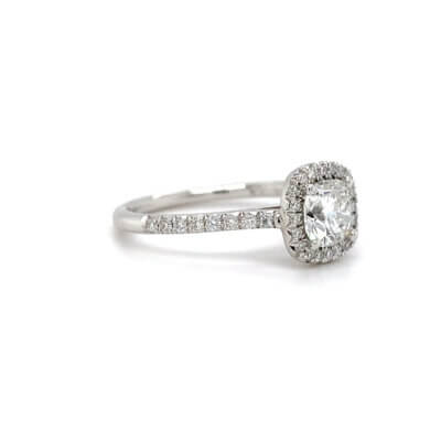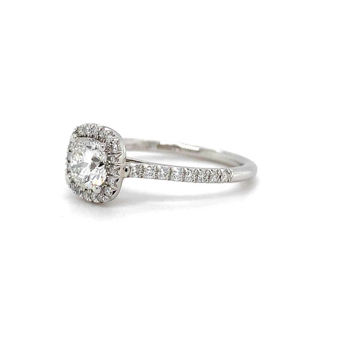 Pre-Owned 0.77ct Cushion cut Diamond Engagement ring with Diamond set halo and shoulders made in Platinum