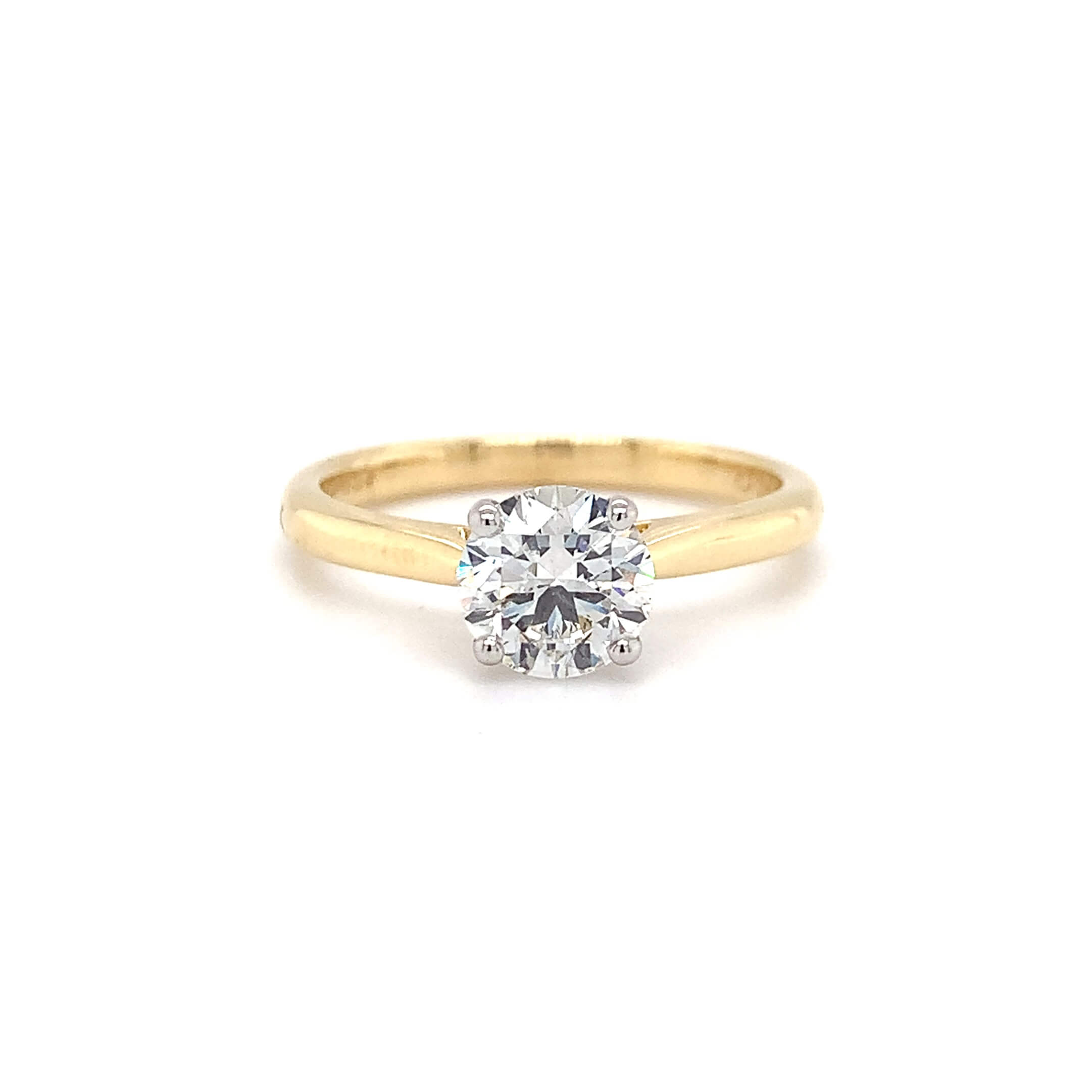 18ct Yellow Gold Pre-owned Engagement ring comprising of a single Round Brilliant cut Diamond, set in 4-claw setting with a plain shank. The Diamond comes with an HRD Diamond Report