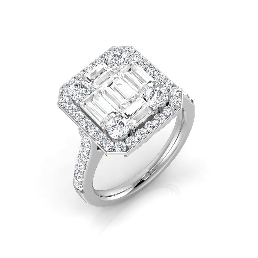 A classic Diamond statement ring comprising of Baguette and Round brilliant cut Natural Diamonds, set in 9ct white gold