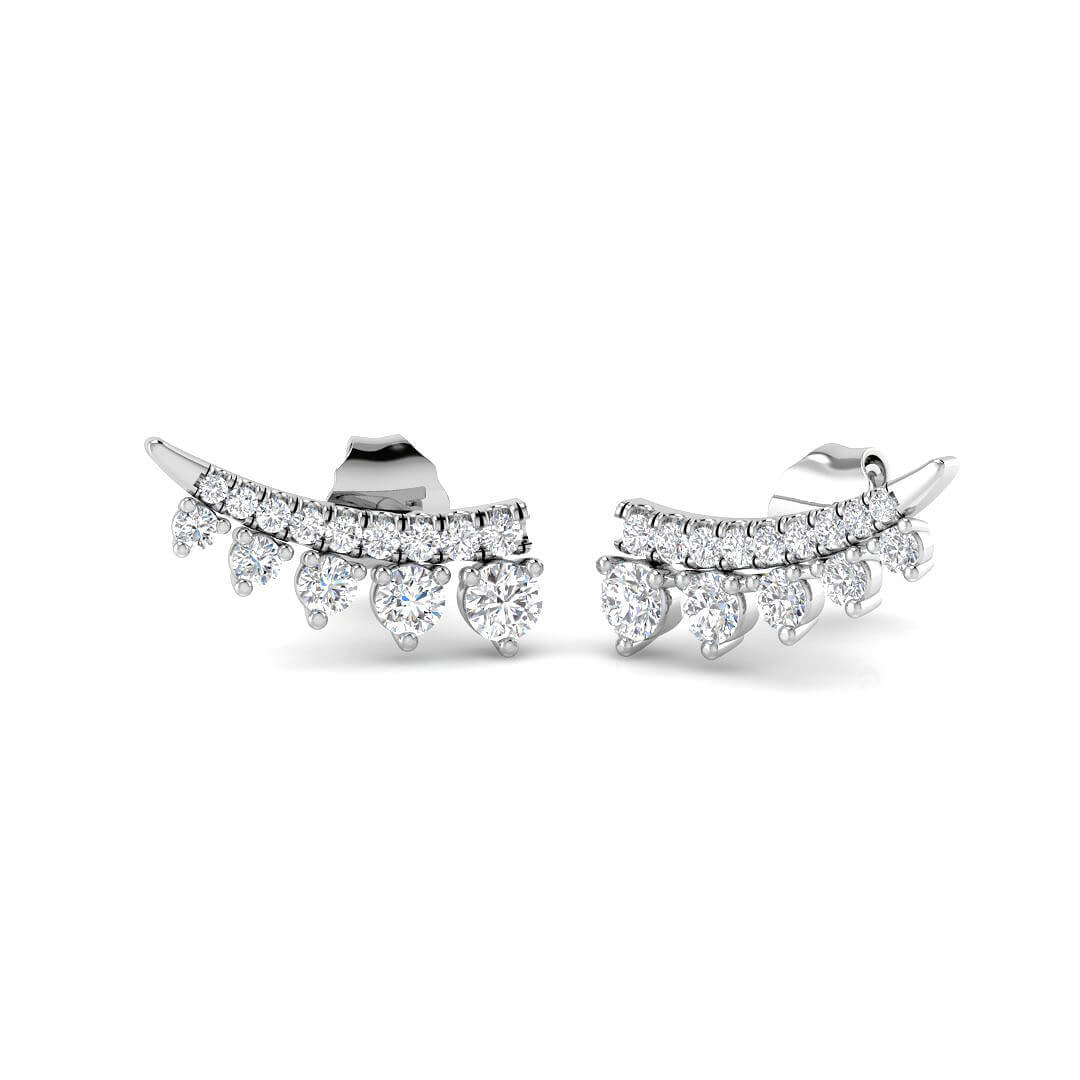 These earrings are diamond ear climbers designed in a modern and elegant style. They feature a curved row of round brilliant-cut diamonds that gracefully follow the contour of the ear.