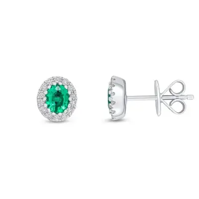 18CT White Gold Oval Emerald & Diamond Cluster Earrings 5x4mm