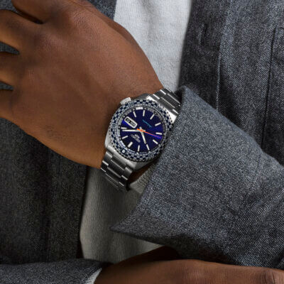As a re-creation of the 1969 piece, this model maintains the looks and petrol blue colour scheme. It features the same dial, 60s-style hands, and checkered bezel as the original. It also pays homage to the fan-favourite Seiko 5 Sports SKX case design.