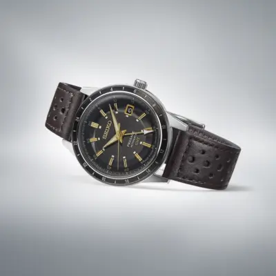 The essence of the Seiko Presage Style 60s collection is vintage style, which continues with the ‘road trip’ theme of this model, inspired by the iconic 1960s cars; their wheels, levers and instruments and colour scheme. Its hairline finishing gives it a machine-like feel, whilst the new GMT dial layout incorporates the details of the original Seiko 1964 crown chronograph.