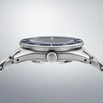 For this latest revival, the design is updated with a more sophisticated specification, heightened water resistance, and improved power reserve. Built in a 40mm stainless steel case, the sapphire crystal glass is surrounded by a deep ‘scuba’ blue bezel and matching dial. In line with professional ISO Diving specification, the hands and indices are coated in glow-in-the-dark Lumibrite whilst its upright date calendar in a 4.5 o’clock position also add to its legibility. For extra comfort and wearability, the bracelet has updated short pitch links and a shorter buckle. It is also slimmer than previous models, with a 13mm depth.