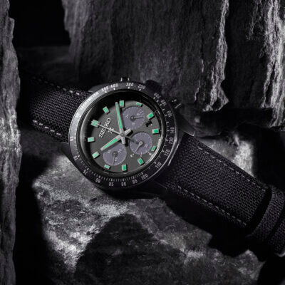 A new edition within the Prospex ‘Black Series’ series collection, this ‘Night Vision’ Speedtimer watch depicts underwater night diving views seen through a night scope.